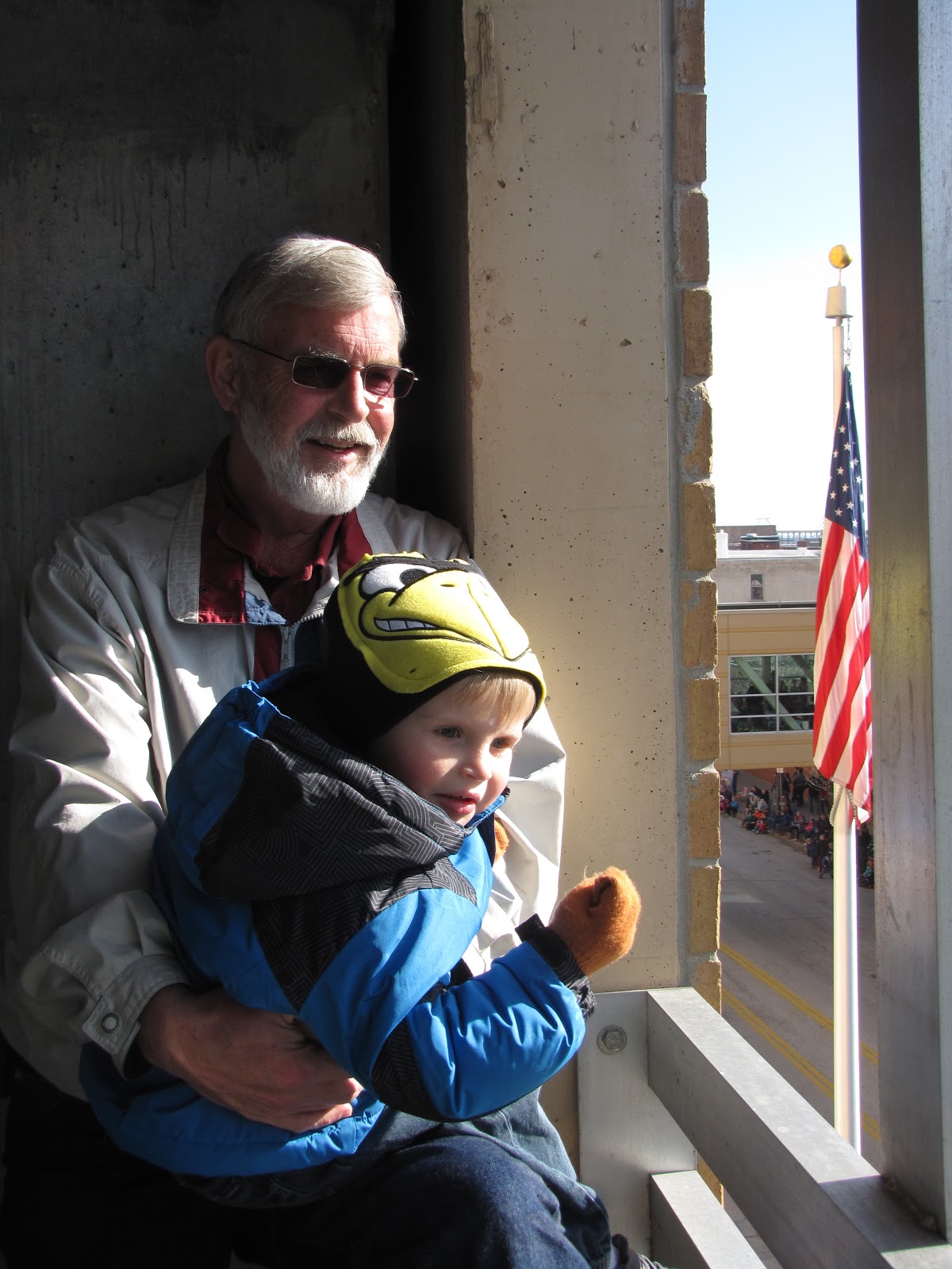 Jason was out of town for the Iowa vs Michigan game with his buddies. Luckily, Nana and Papa offered to go to the parade with us, otherwise we would have missed out. I am just not that brave! We watched the parade from up in the parking ramp to get a good view of the balloons. It was a bit windy up there though!